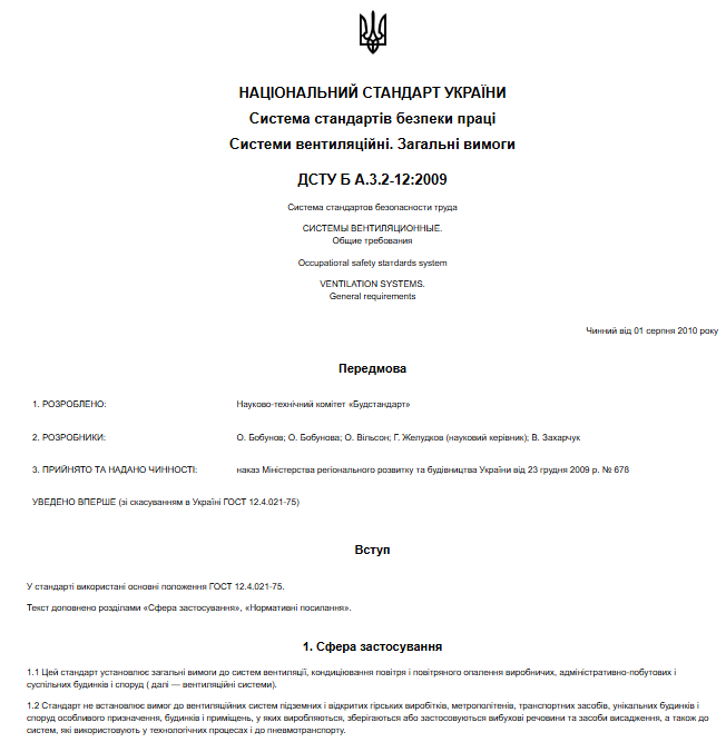 Стандарт установлює загальні вимоги до систем вентиляції, кондиціювання повітря і повітряного опалення виробничих, адміністративно-побутових і суспільних будинків і споруд